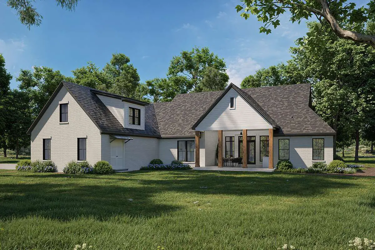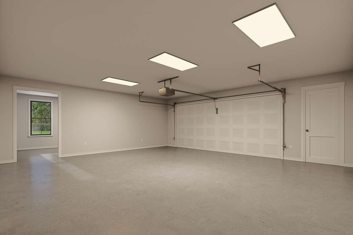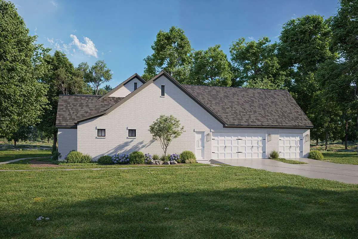 The spacious side-entry garage keeps vehicles and storage neatly tucked away from the primary façade while maintaining a cohesive architectural presence.