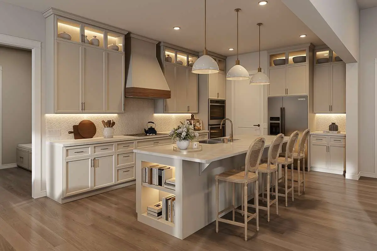 The kitchen serves as a central hub with plenty of counter space, a generous island for prep and casual dining, and easy access to adjacent areas. Ample storage in cabinetry and pantry zones ensures organized everyday living without clutter.