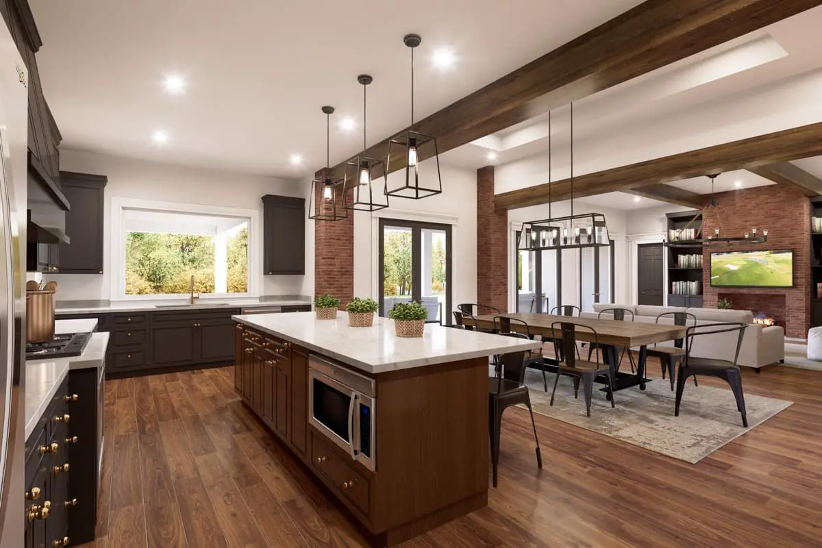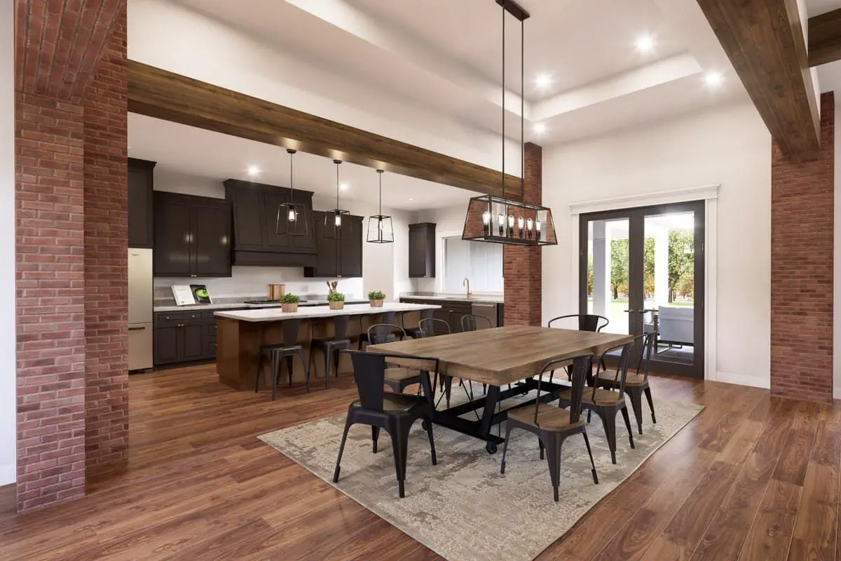 Stepping inside, you’re greeted by a foyer that opens directly into an expansive shared living core. The great room, dining area, and kitchen form a continuous open plan that promotes connection and interaction among family and guests.