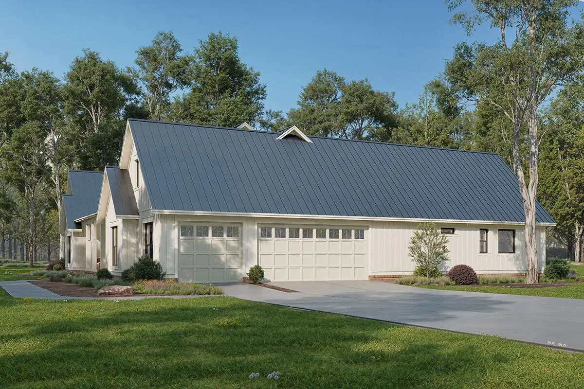 Large multi-panel windows and double porch spaces (front and rear) enhance natural light and encourage indoor-outdoor connection. The attached three-car garage not only provides ample parking and storage but also integrates seamlessly into the home’s overall aesthetic.
