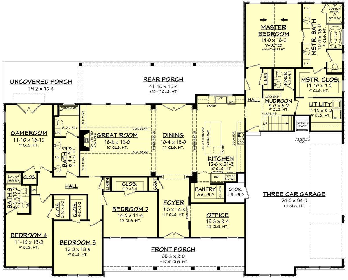 Three additional bedrooms are placed toward the opposite side of the home, creating a balanced split-bedroom layout that enhances privacy and comfort. Each bedroom includes walk-in closet space and convenient access to full bathrooms, making this plan especially family-friendly. Because of their flexible configuration, these rooms can also be adapted to serve as home offices, craft spaces, or guest suites if needed.
