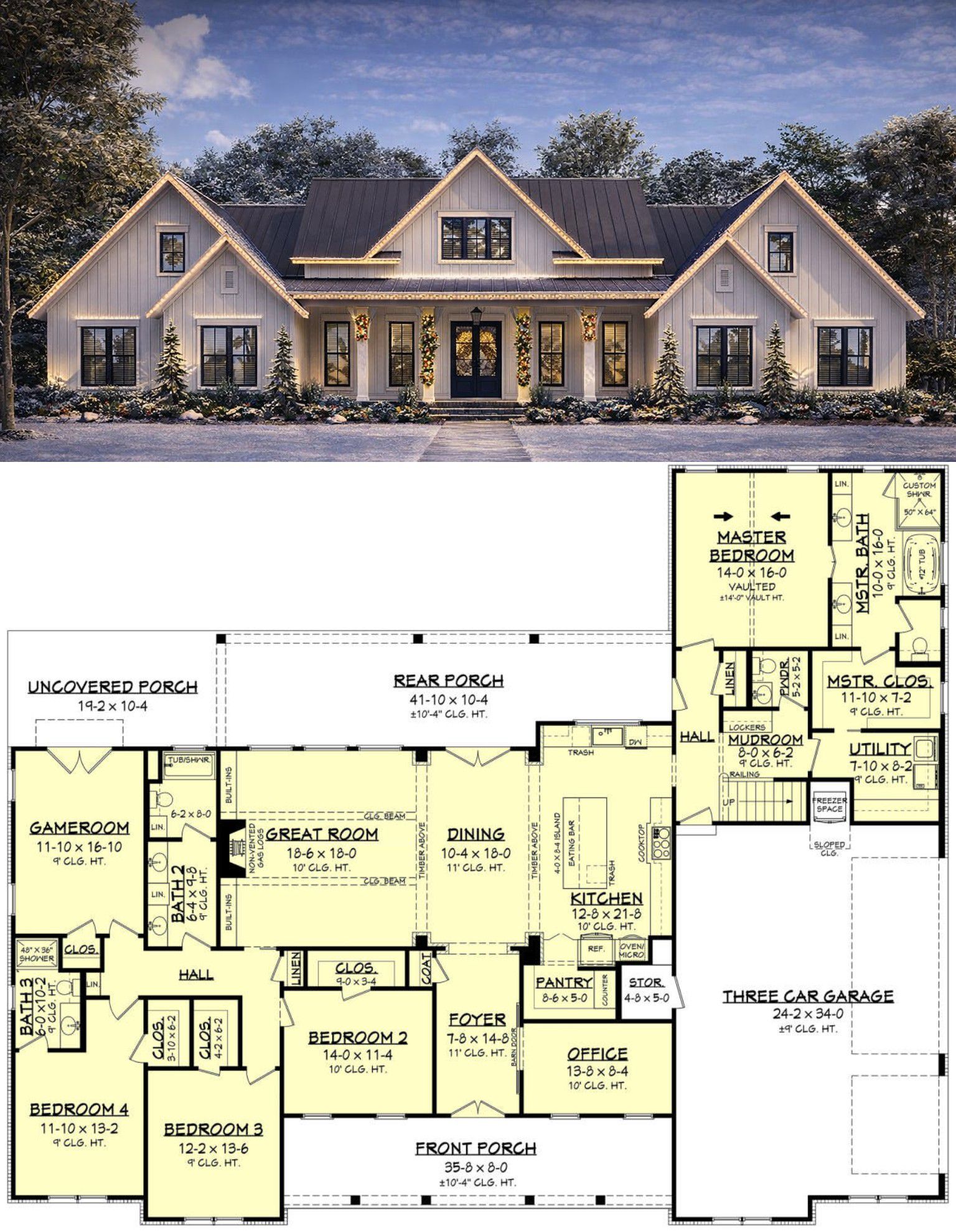 This modern farmhouse plan offers approximately 3,086 sq ft of beautifully arranged single-story living space that balances contemporary farmhouse charm with practical everyday design. The layout includes 4 bedrooms, 3 full bathrooms + 1 half bath, and an attached 3-car garage.