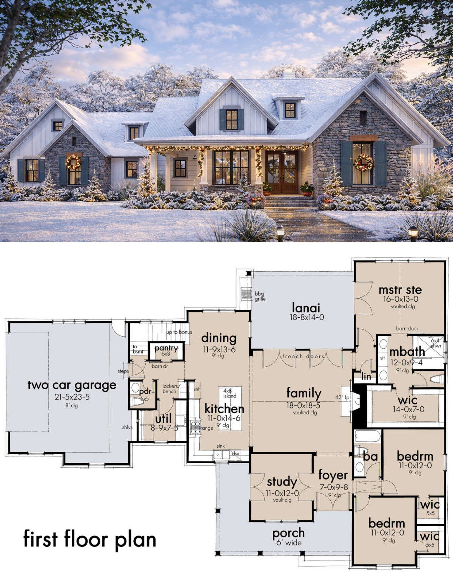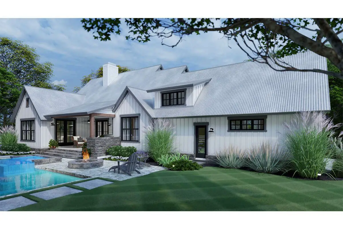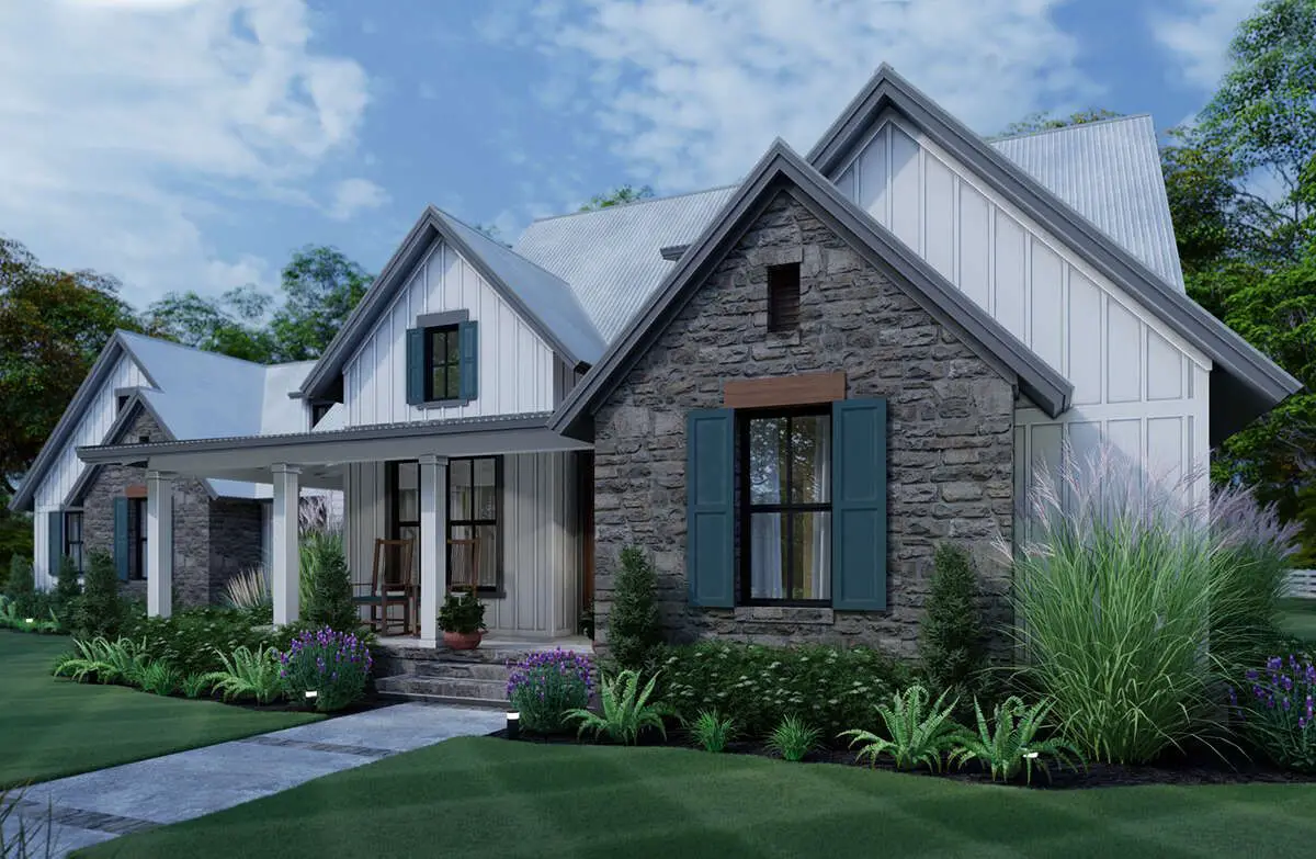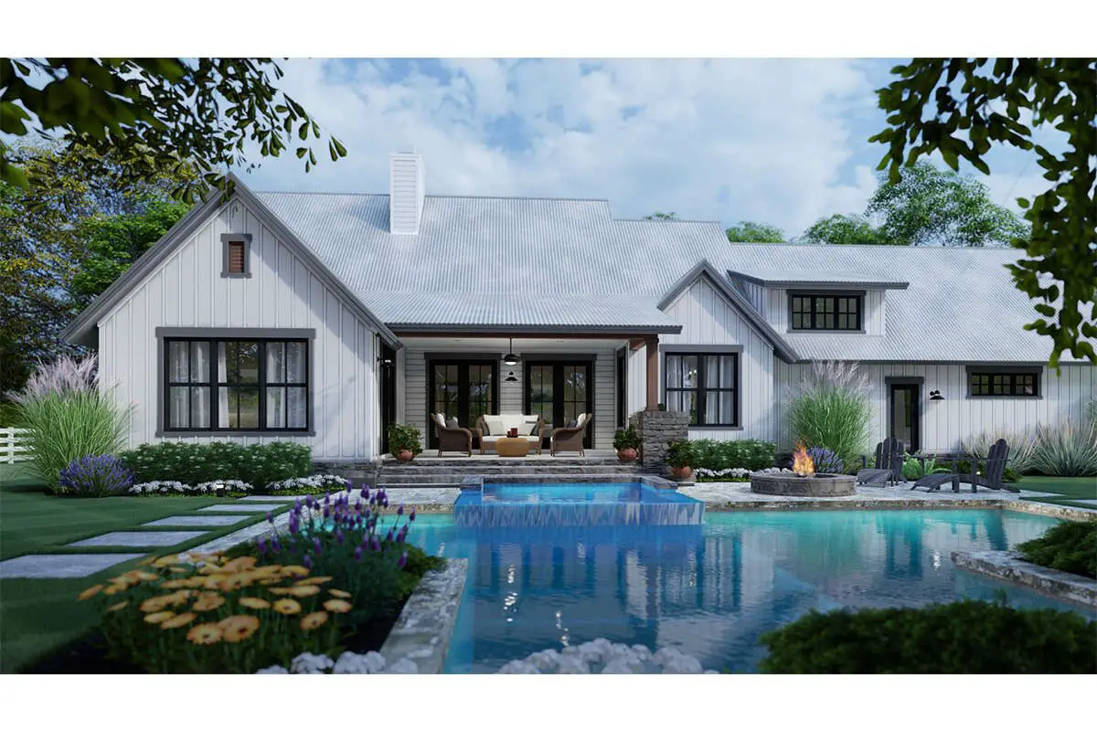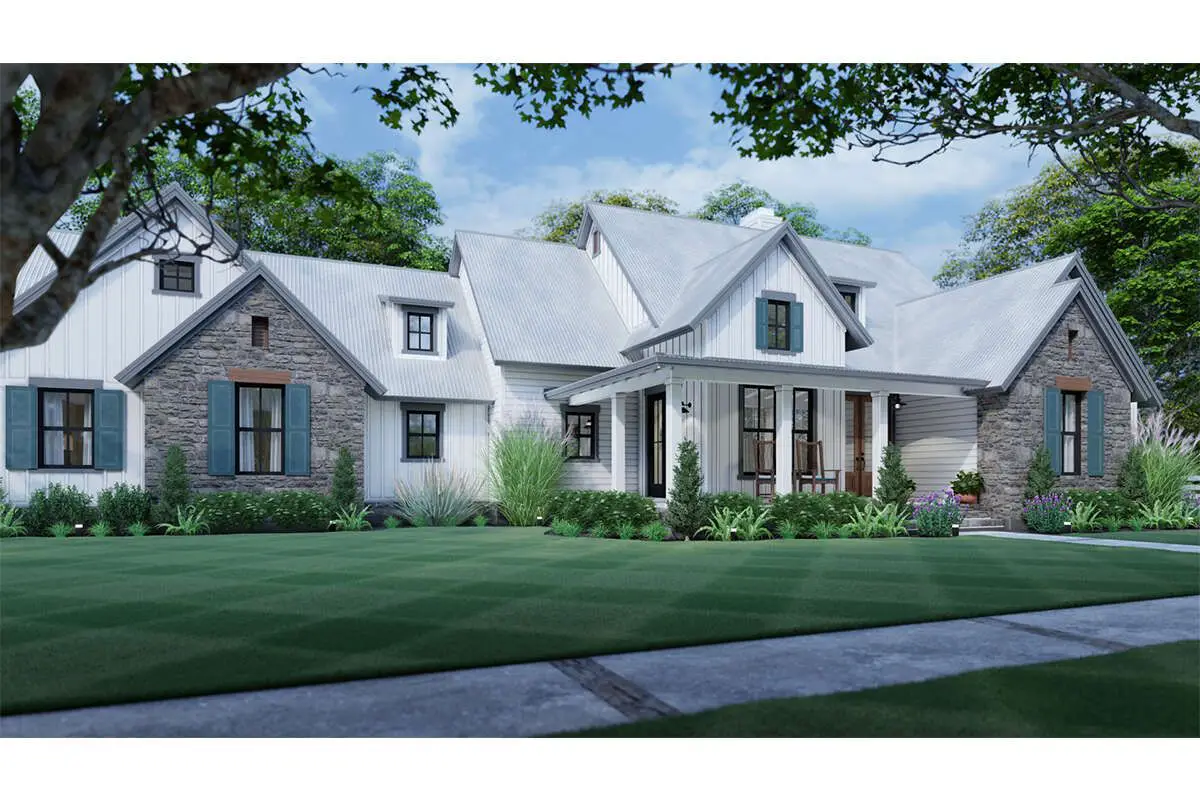 This inviting one-story modern farmhouse design blends classic farmhouse styling with efficient living spaces across approximately 1,988 square feet.