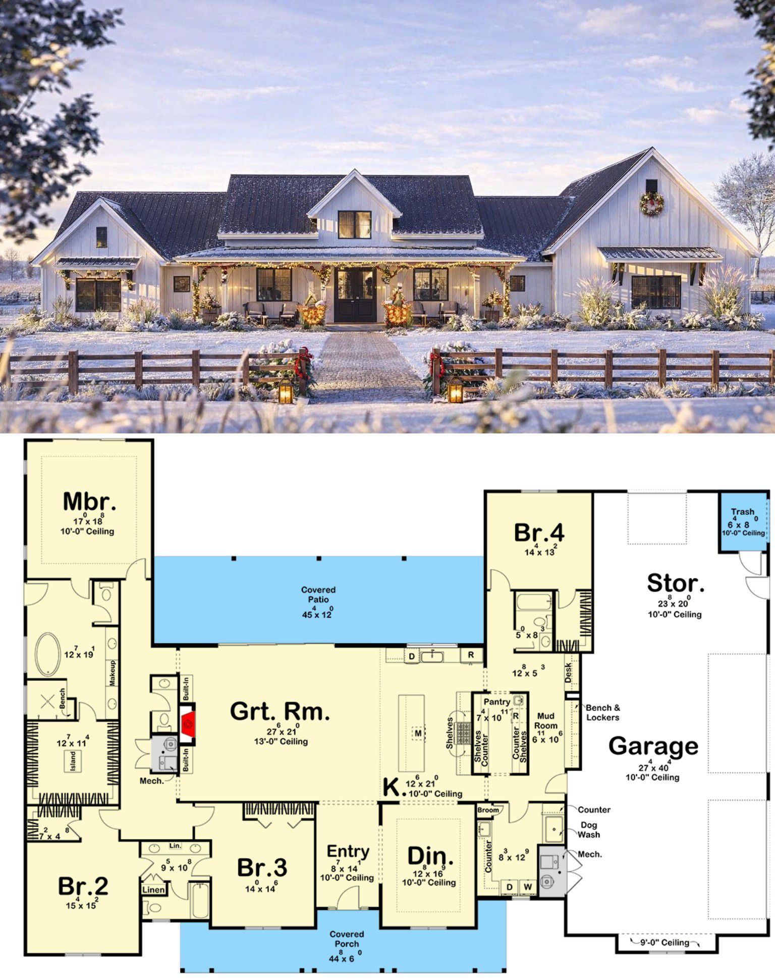 The exterior showcases modern farmhouse charm with clean lines, mixed materials, and a welcoming covered porch design. With overall dimensions of approximately 102′ 0″ wide and 73′ 0″ deep, the home makes a substantial visual impact on a broad lot.