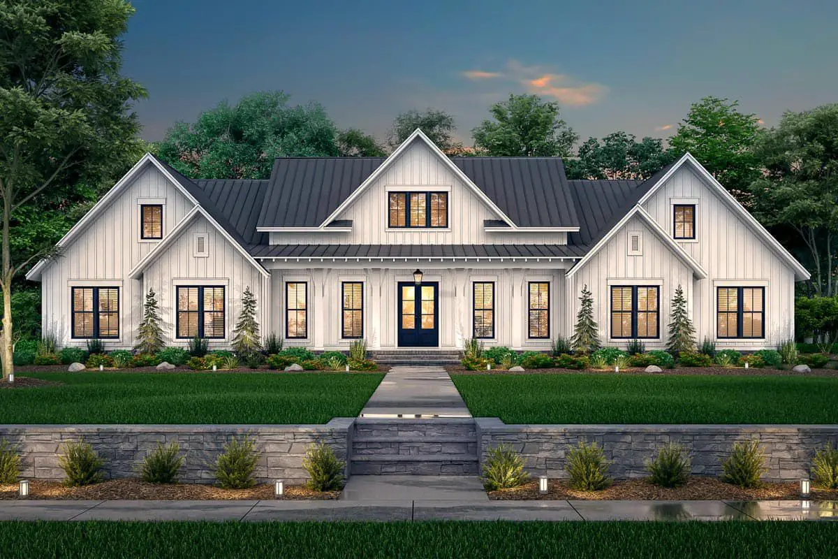 The exterior blends classic farmhouse elements (such as board-and-batten siding and balanced rooflines) with modern detailing for strong curb appeal.