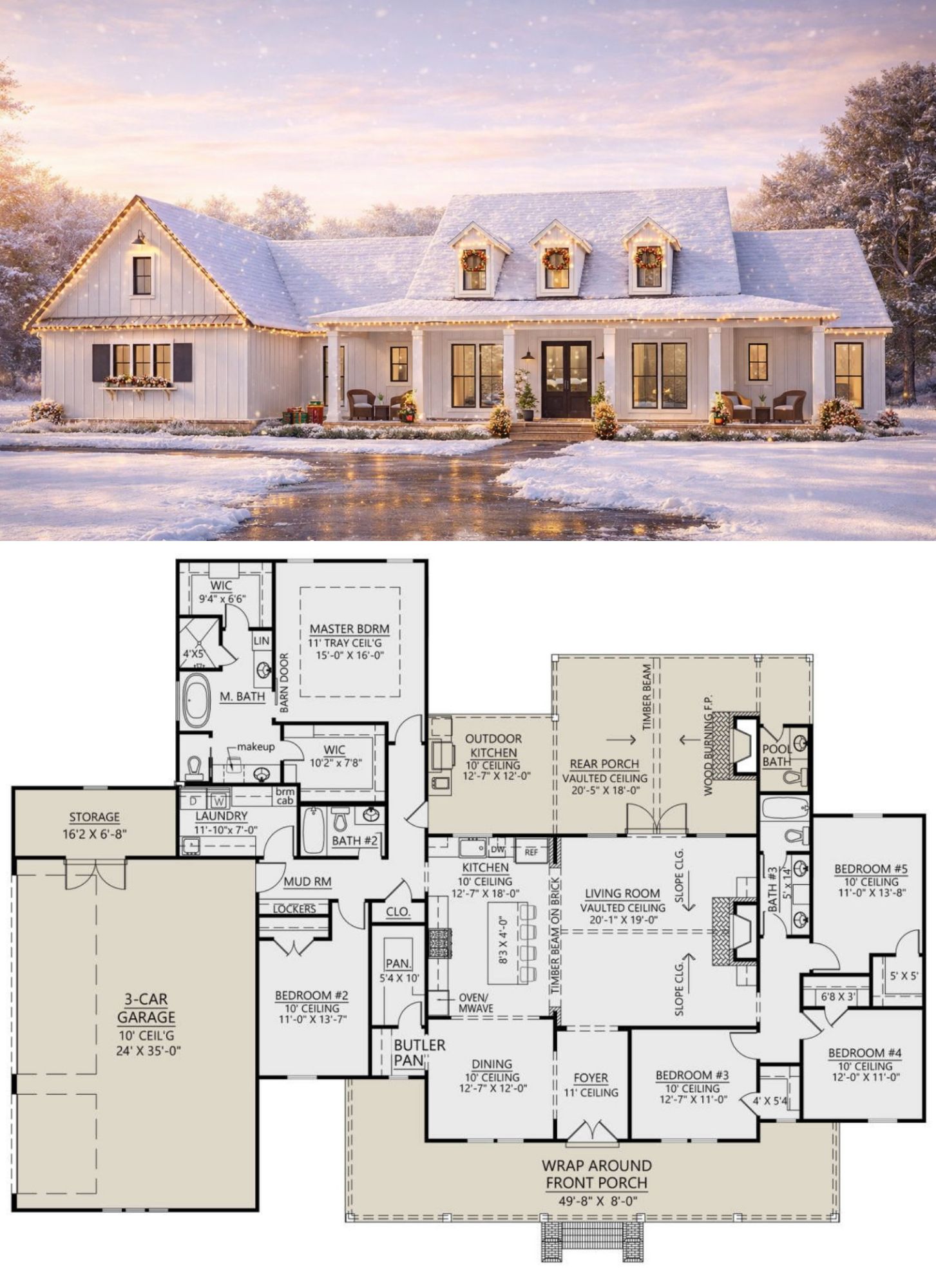 This Modern Farmhouse plan is ideal for families seeking a **generational home** with comfortable daily flow and spaces for guests. Its open-plan living accommodates everyday life and entertaining, while the wrap-around porch and rear outdoor kitchen extend living into the outdoors. Private bedroom zones, generous storage, and functional transition spaces like a mudroom and pantry enhance convenience and long-term livability. 16