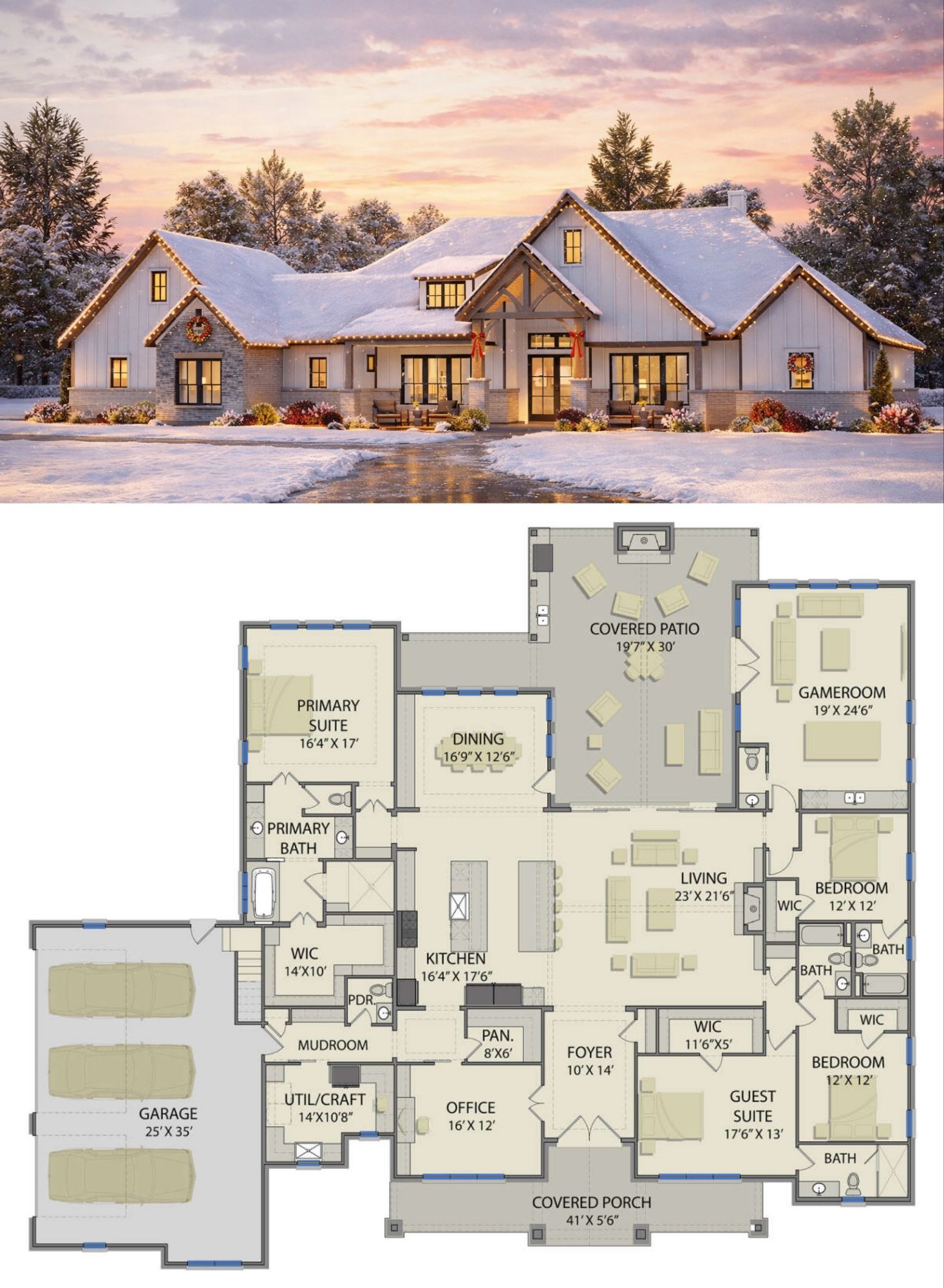 This modern farmhouse plan is designed for families who want a balance of open communal space and defined private zones. Its generous living areas support both everyday routines and special gatherings, while multiple bathrooms and flexible bedroom layouts help reduce congestion. The covered porches enhance everyday outdoor living and extend entertaining space. 13