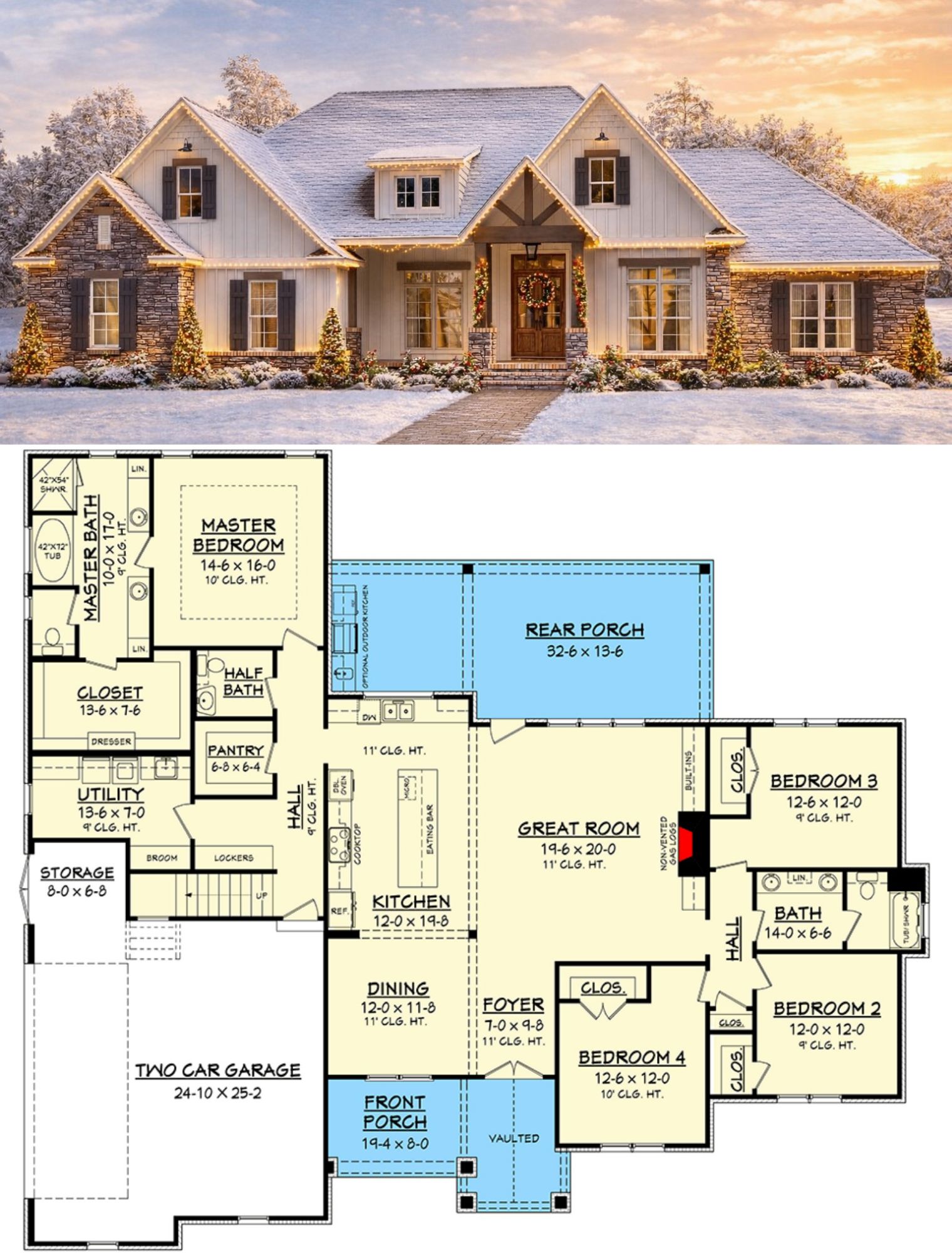 The exterior reflects authentic Craftsman character with a combination of stone and siding, decorative gables, and tapered porch columns that create visual depth and welcoming presence. A covered front porch provides a classic outdoor space for relaxing and greeting guests, while the home’s overall proportions – roughly 68′ wide by 78′ deep – help it fit comfortably on a variety of lot sizes. The architectural elements work together to deliver a look that’s both timeless and immediately appealing.