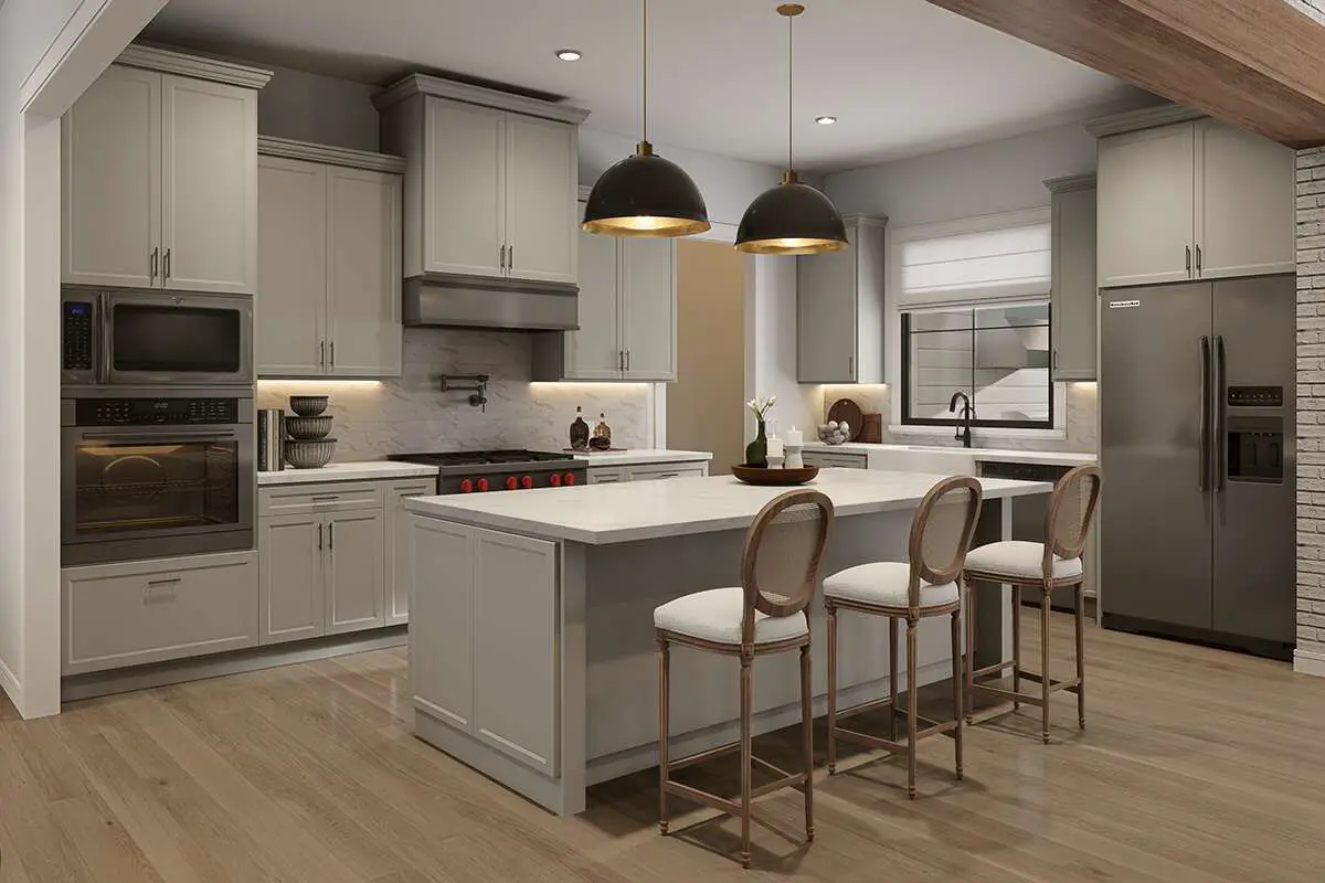The central kitchen is designed for both everyday use and entertaining, with a generous island for prep and casual seating, walk-in pantry storage, and easy sightlines to the rest of the living area.