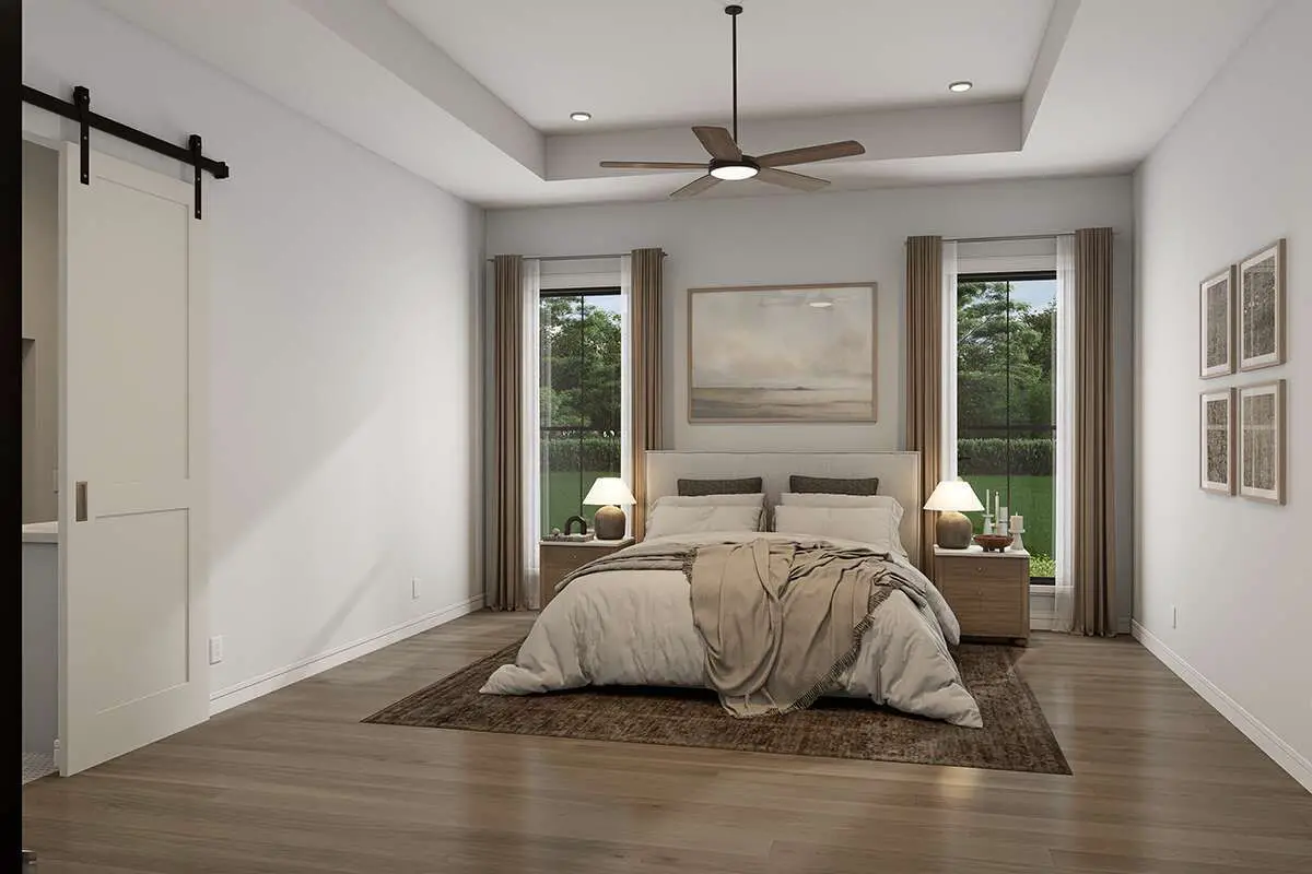 The primary suite feels like a private sanctuary off the main living area. It features a tray ceiling for architectural interest and a spa-like ensuite bathroom with dual vanities, a soaking tub, a separate shower, and large walk-in closets — providing space and comfort for everyday routines.