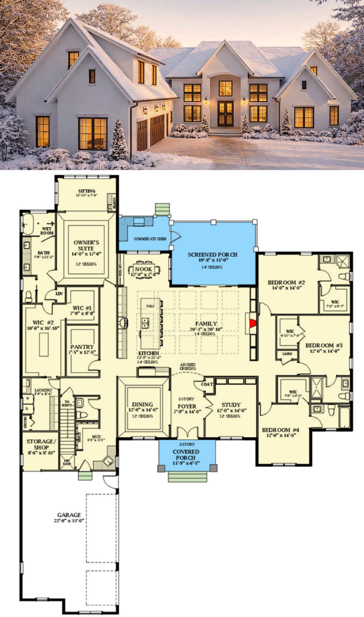 This European Transitional plan supports modern family living by combining open gathering spaces with private retreats. The open floor plan invites togetherness, while split bedroom zones ensure privacy when needed. Multiple porches extend usable space outdoors, and the screened porch provides shaded comfort throughout the seasons.20