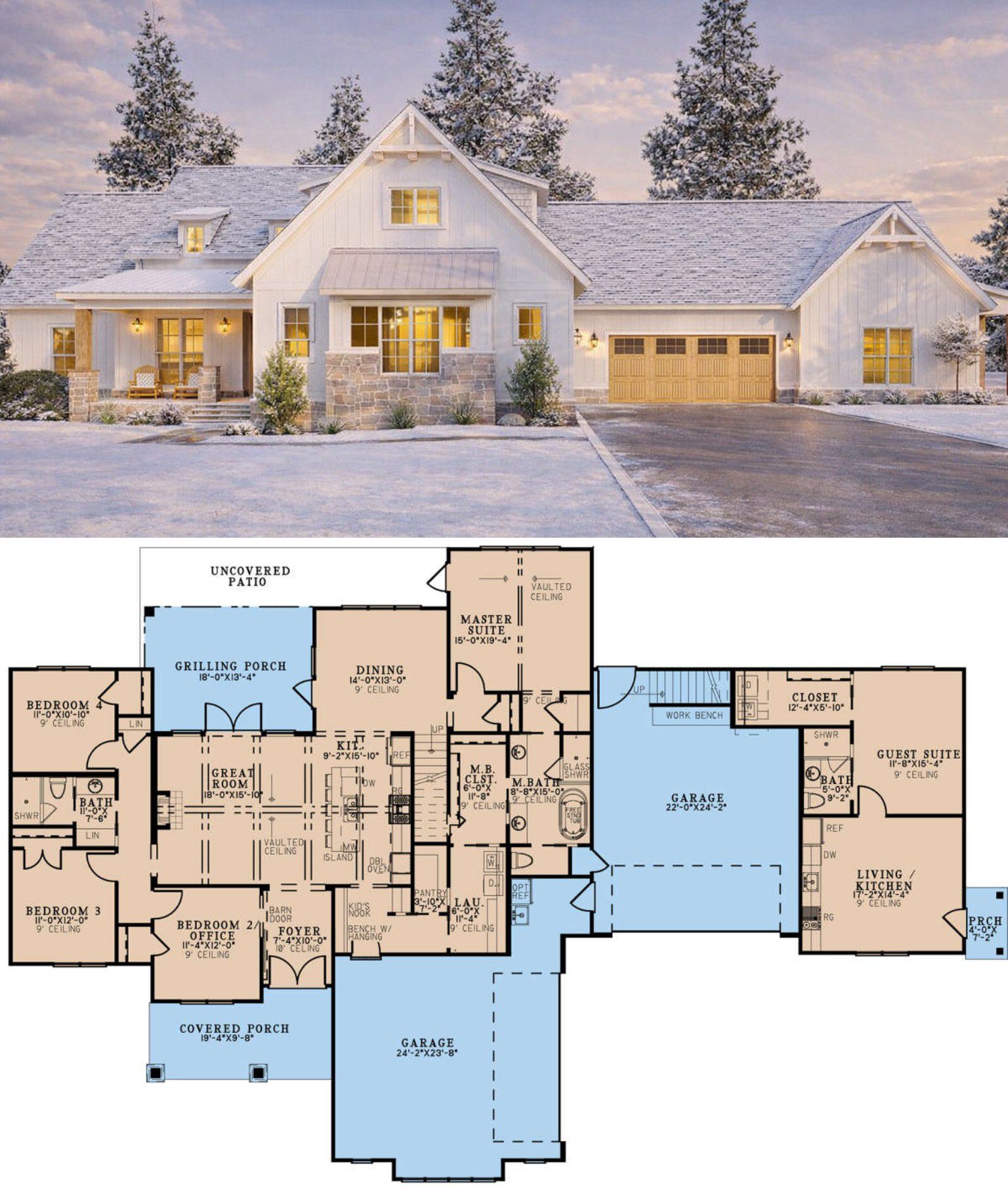 This plan is ideal for growing families, multigenerational households, or anyone who wants room to entertain and live comfortably without losing that warm farmhouse vibe.0