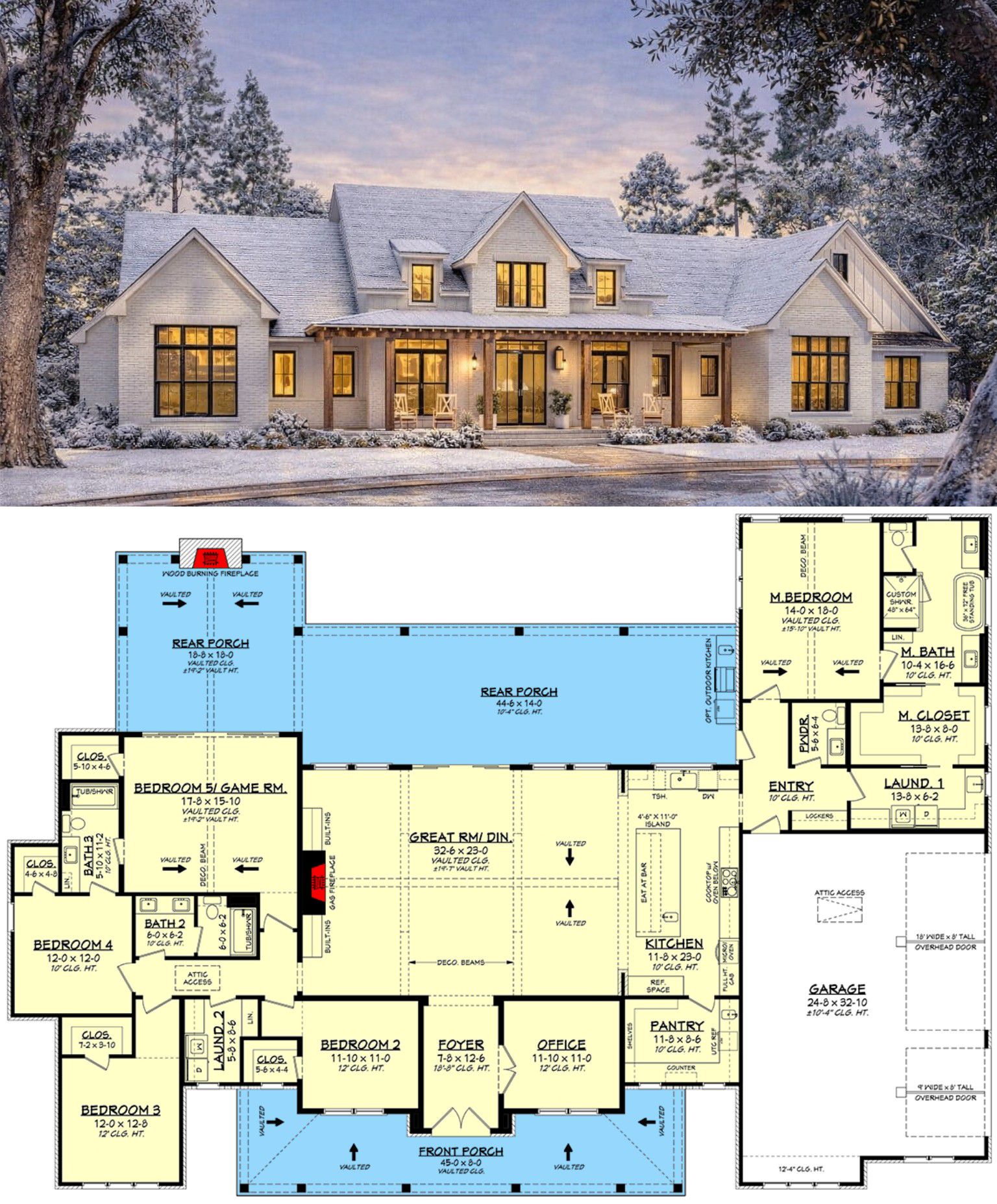 This grand modern farmhouse is designed for families who love gathering together and hosting with ease. The open living spaces make everyday interactions feel natural and connected, while split bedroom zones and private retreats help keep noise down and comfort high. The expansive rear porch with its outdoor kitchen and fireplace becomes an extension of your living space, perfect for summer dinners, holiday cookouts, or quiet evenings around the fire. Practical spaces like the office, mudroom, and accessible laundry add smooth convenience to daily life.10