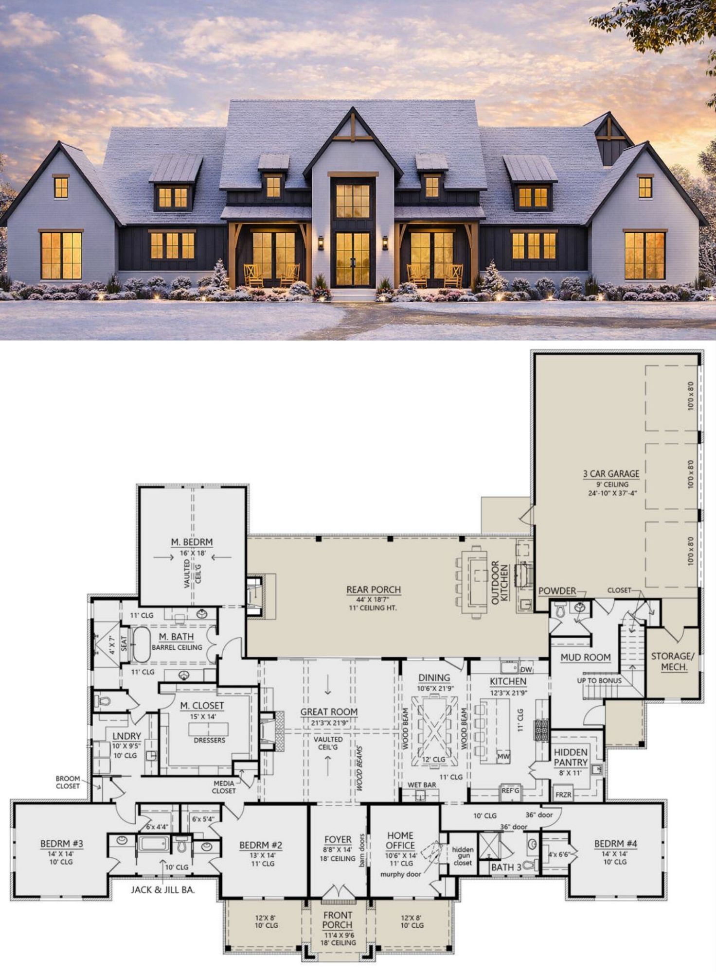 This generous modern farmhouse design delivers about 3,877 square feet of thoughtfully arranged living space with four bedrooms, three full bathrooms, one half bathroom, and a spacious three-car garage.
