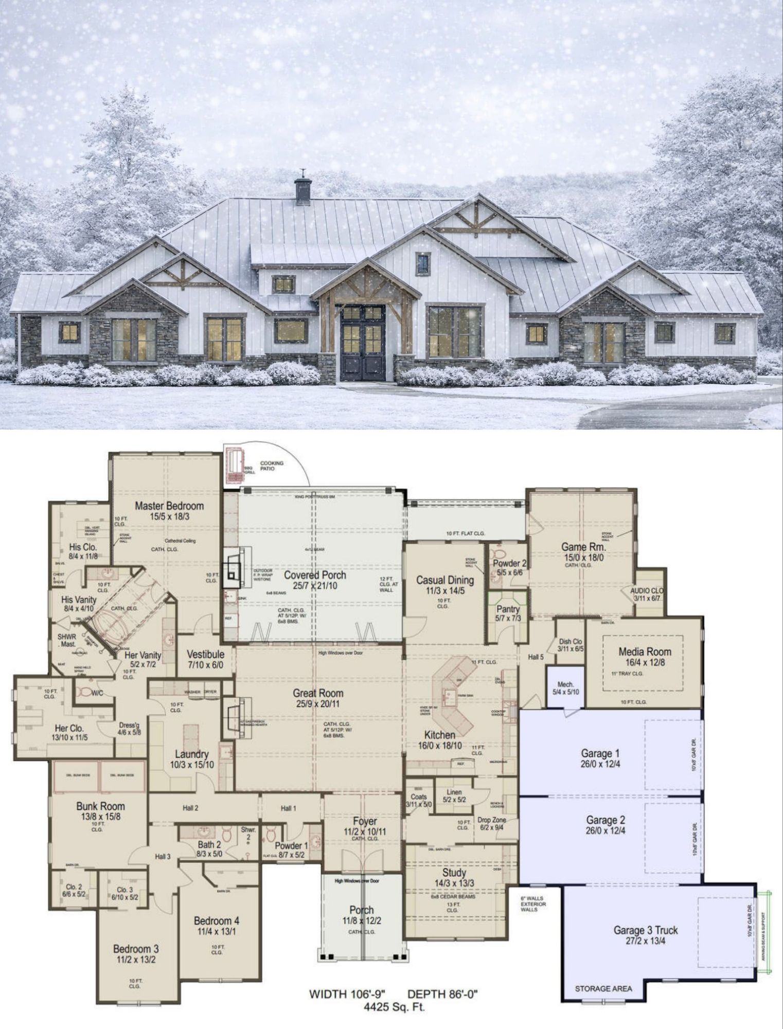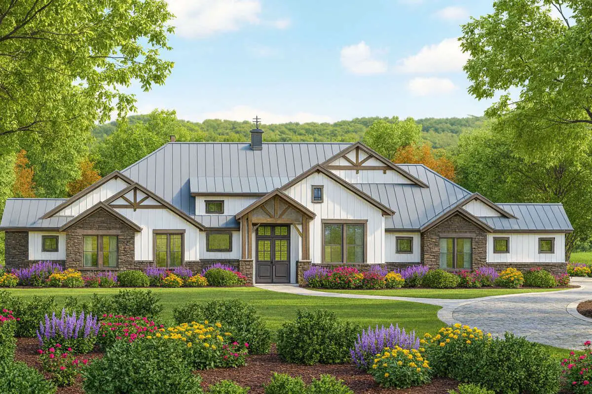 The overall footprint — approximately 100’ wide by 85’ deep — anchors the home beautifully on larger suburban or countryside lots.