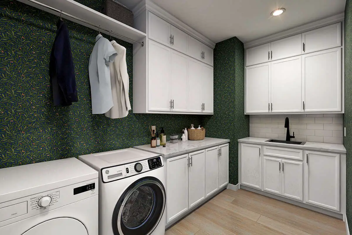 Storage and daily chores are supported by thoughtful placement of closets and a dedicated laundry room. A mudroom area near the garage entry helps contain backpacks, shoes, and outdoor gear before it travels into the heart of the home — a smart transition that keeps everyday living organized and uncluttered.