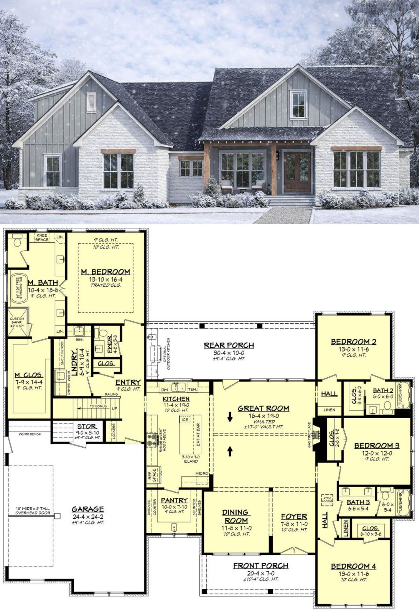 The exterior presents classic modern farmhouse charm with balanced proportions, board-and-batten siding, and tall windows that let light flood the interior. A welcoming covered front porch helps define the home’s curb appeal, providing space for seating, seasonal décor, and relaxed greetings with neighbors. The overall footprint — about **76’-6″ wide by 58’-4″ deep** — fits easily on suburban or countryside lots while maintaining a strong presence from the street.