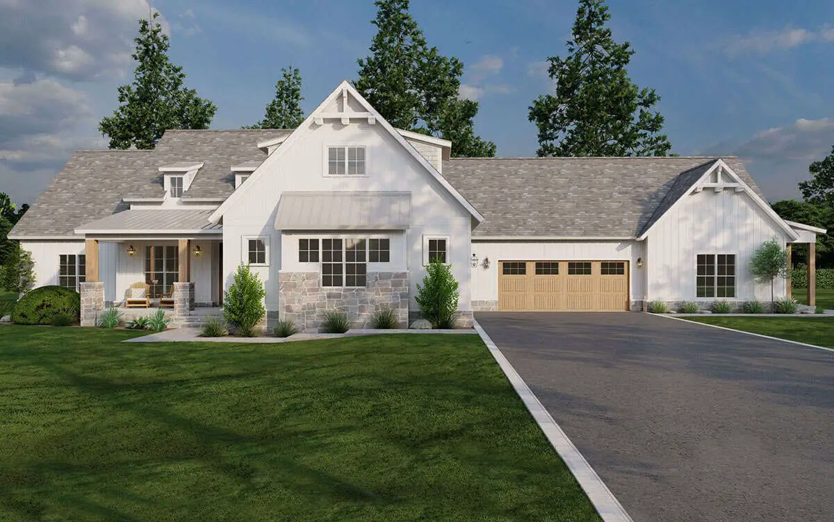 The design balances traditional farmhouse charm with contemporary refinement, making it suitable in both rural and suburban settings.