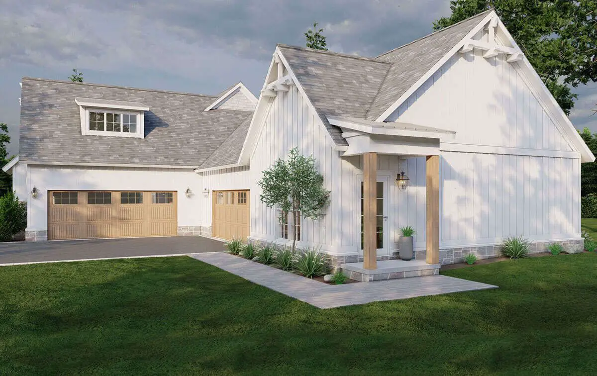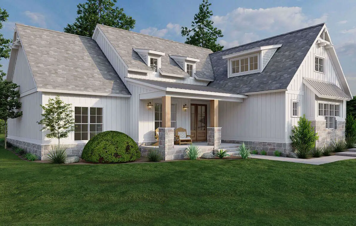 This modern farmhouse plan supports everyday living with generous gathering zones, private bedroom retreats, and outdoor covered spaces that extend your functional footprint. Open sightlines between kitchen, dining, and great room areas make socializing during meals or gatherings feel natural and connected. Practical features like a dedicated laundry room, flexible secondary spaces, and thoughtful storage solutions help keep daily routines organized and efficient. Covered porch areas invite outdoor enjoyment in comfort, making this home a relaxing and functional place to live.